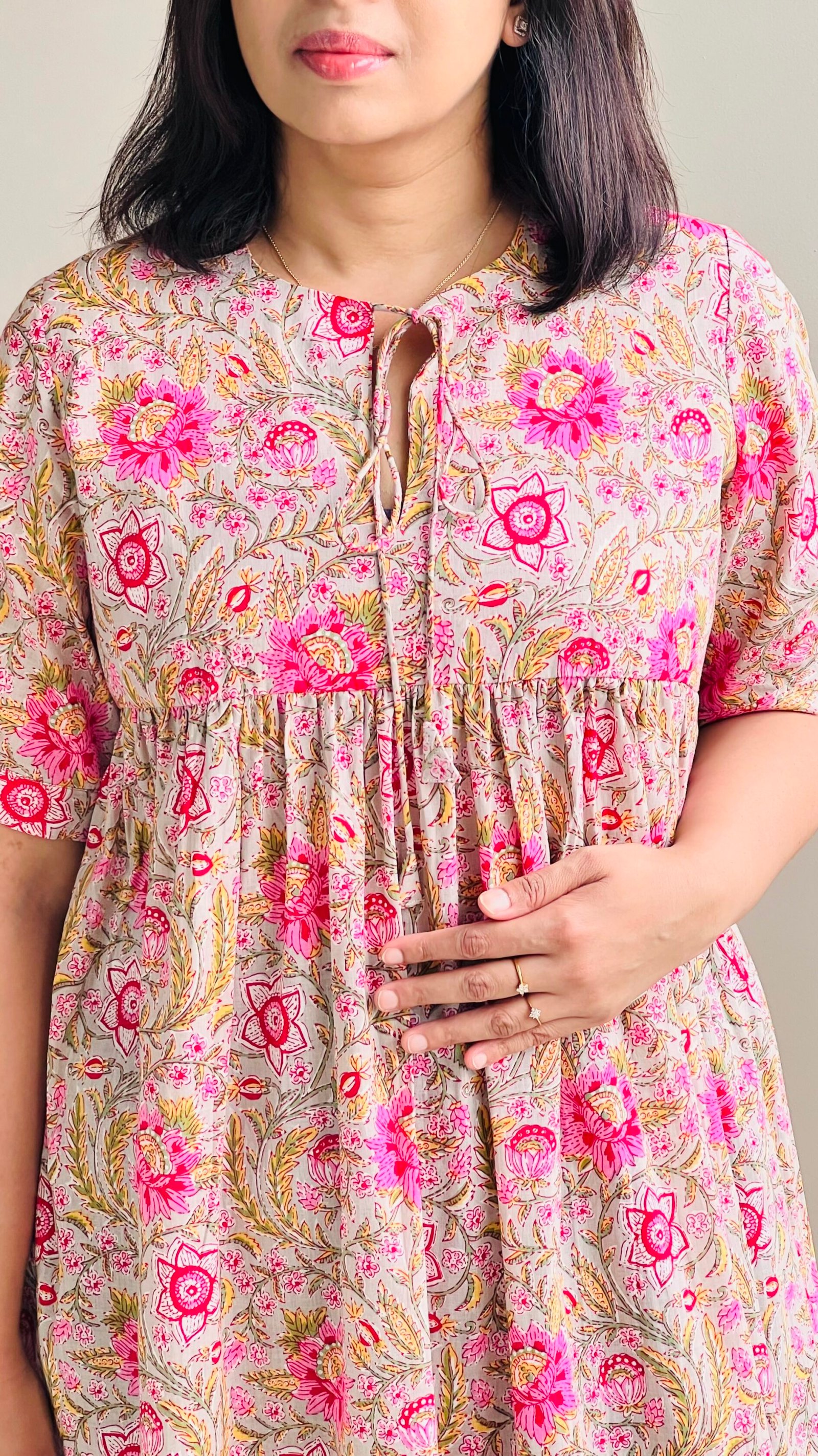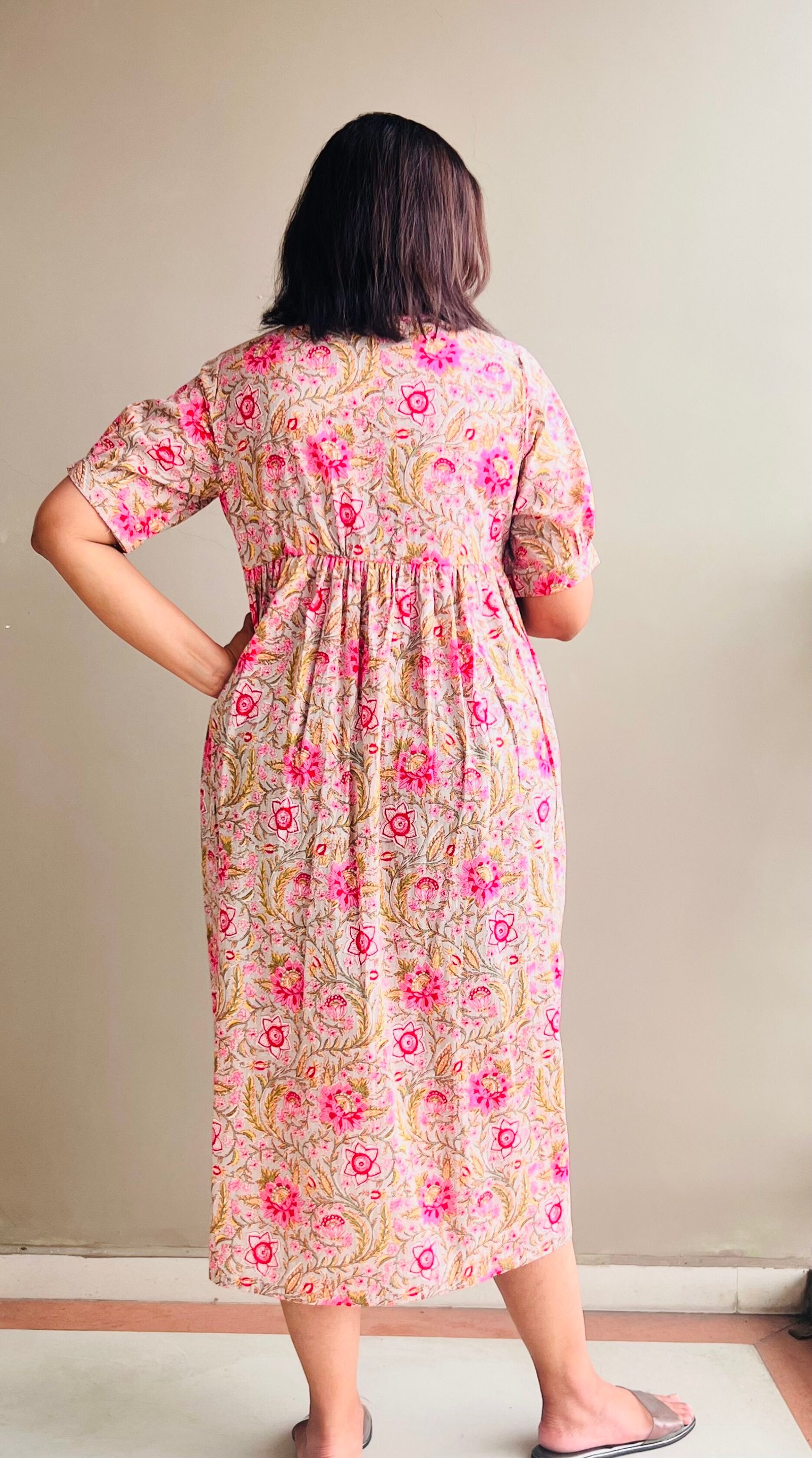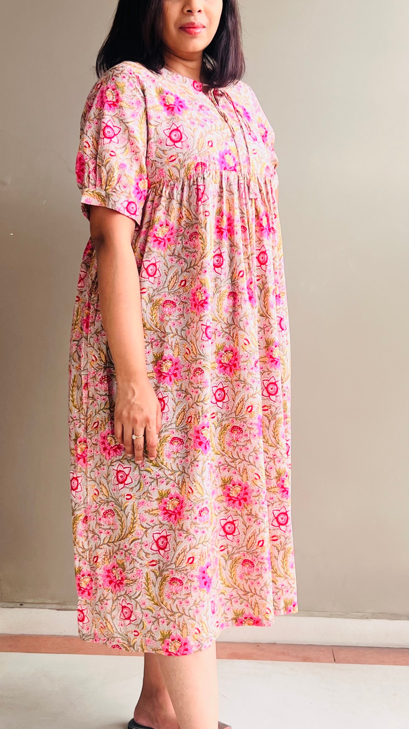 A breezy cotton dress with hand-printed floral motifs in pink and green. Designed with a relaxed fit, gathered waist, and short sleeves, it’s perfect for everyday comfort and casual wear.