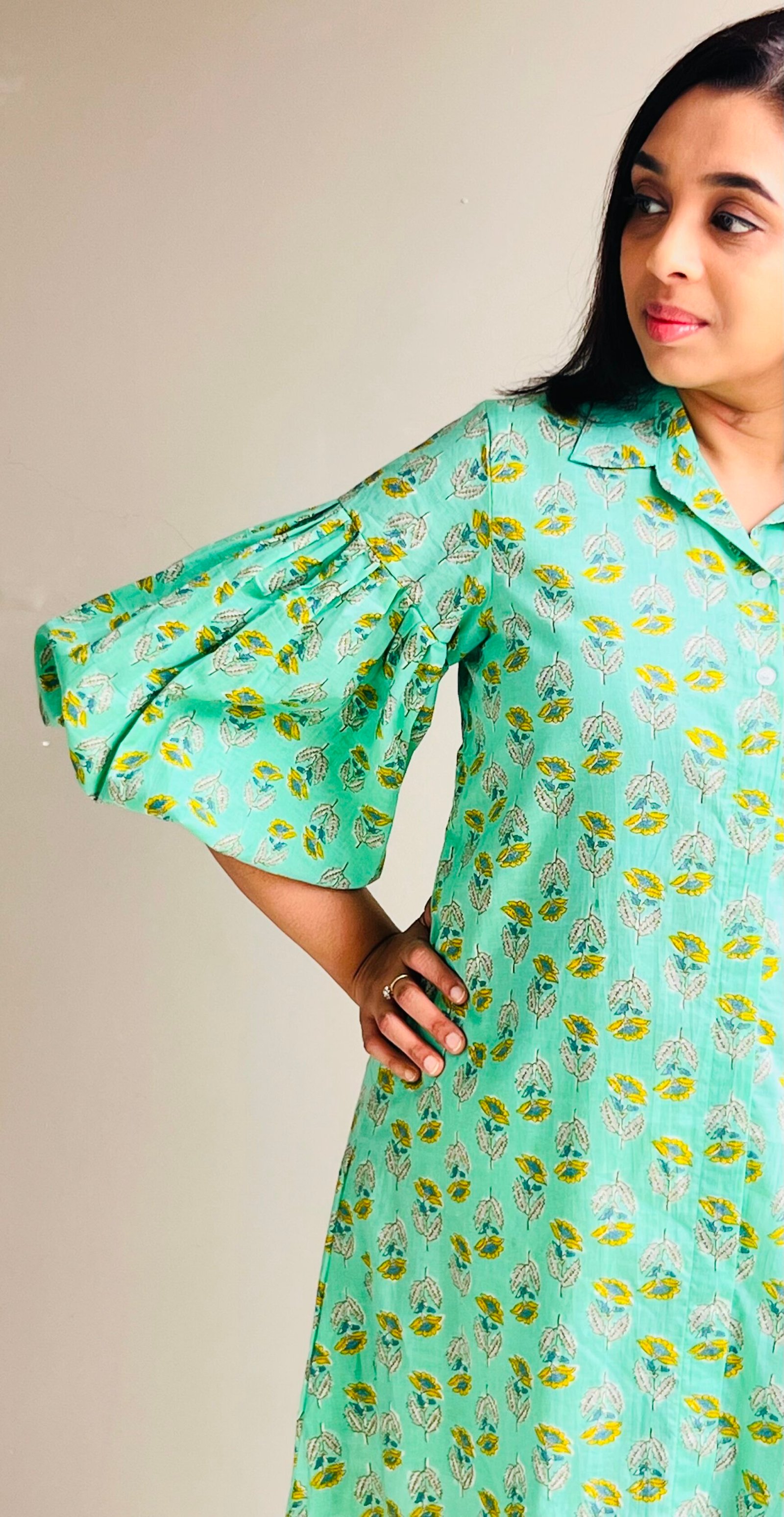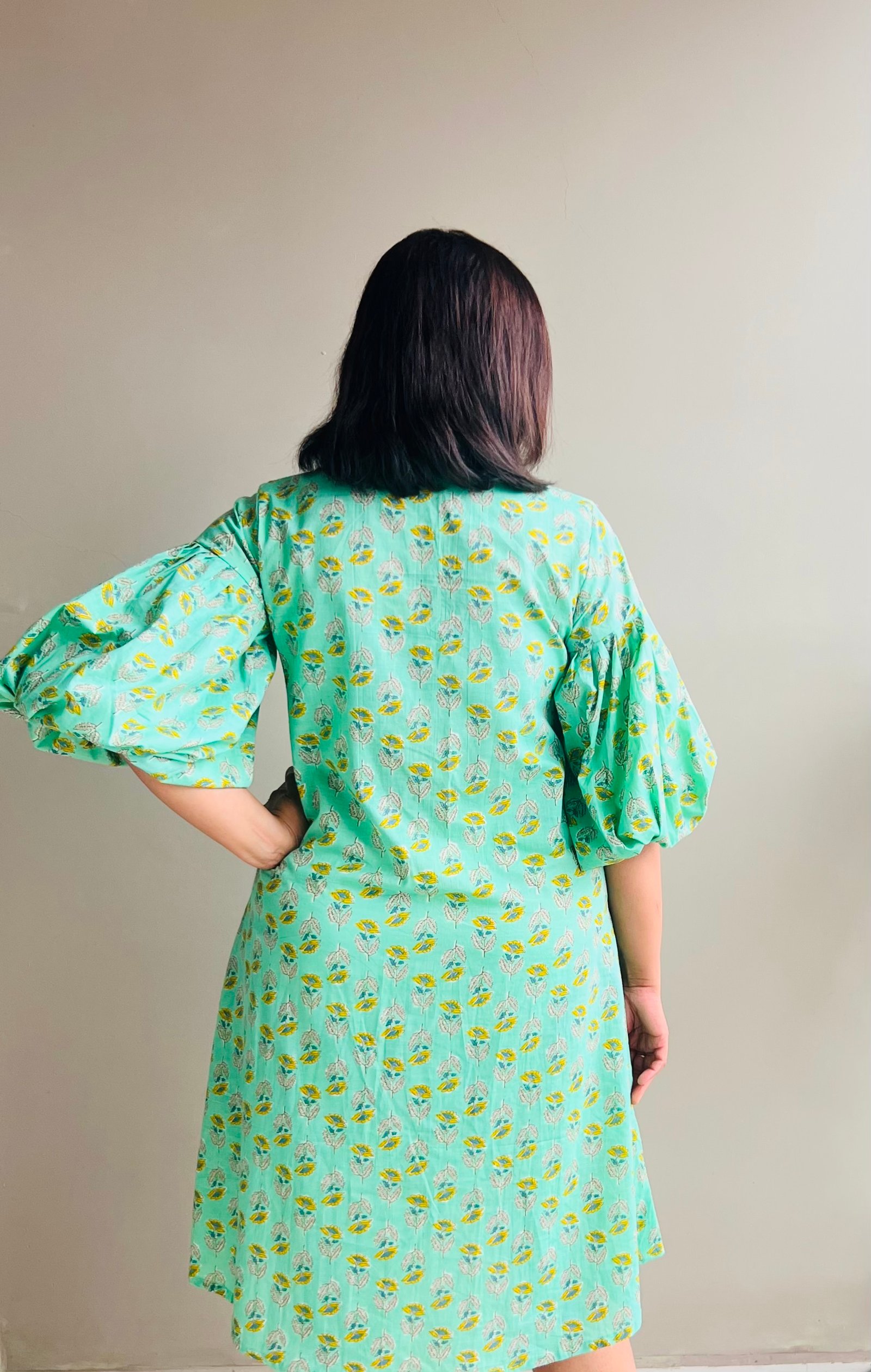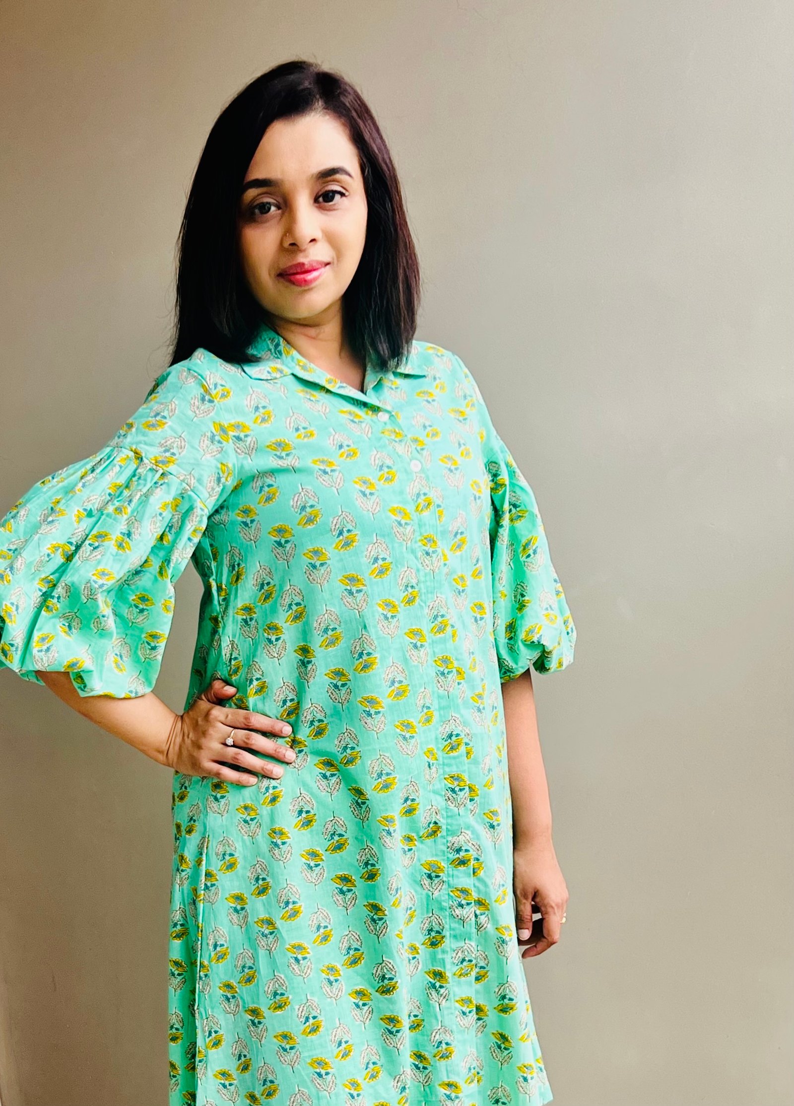 Fresh and contemporary, this mint green block print dress is all about effortless comfort with a playful twist. The standout feature is the voluminous puff sleeves that adds a modern edge to the classic shirt-dress silhouette. Made from soft cotton with an all-over floral print, it’s the perfect balance of relaxed and chic, designed to keep you stylish through the day.