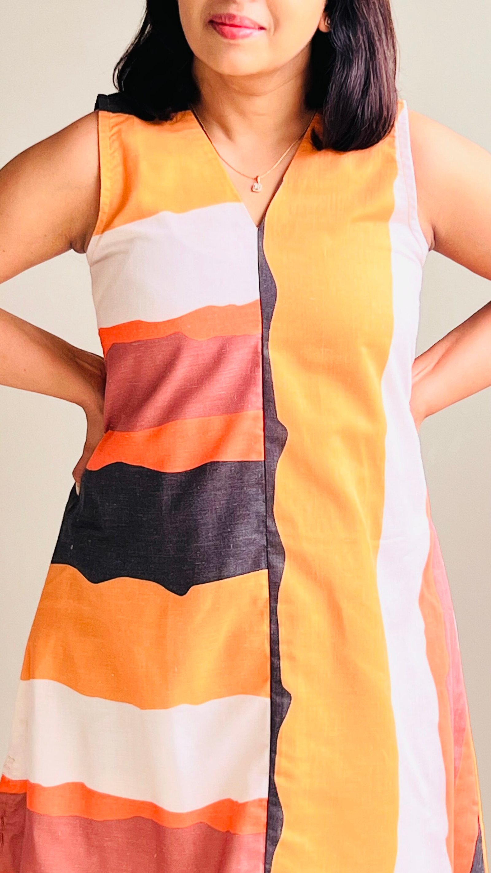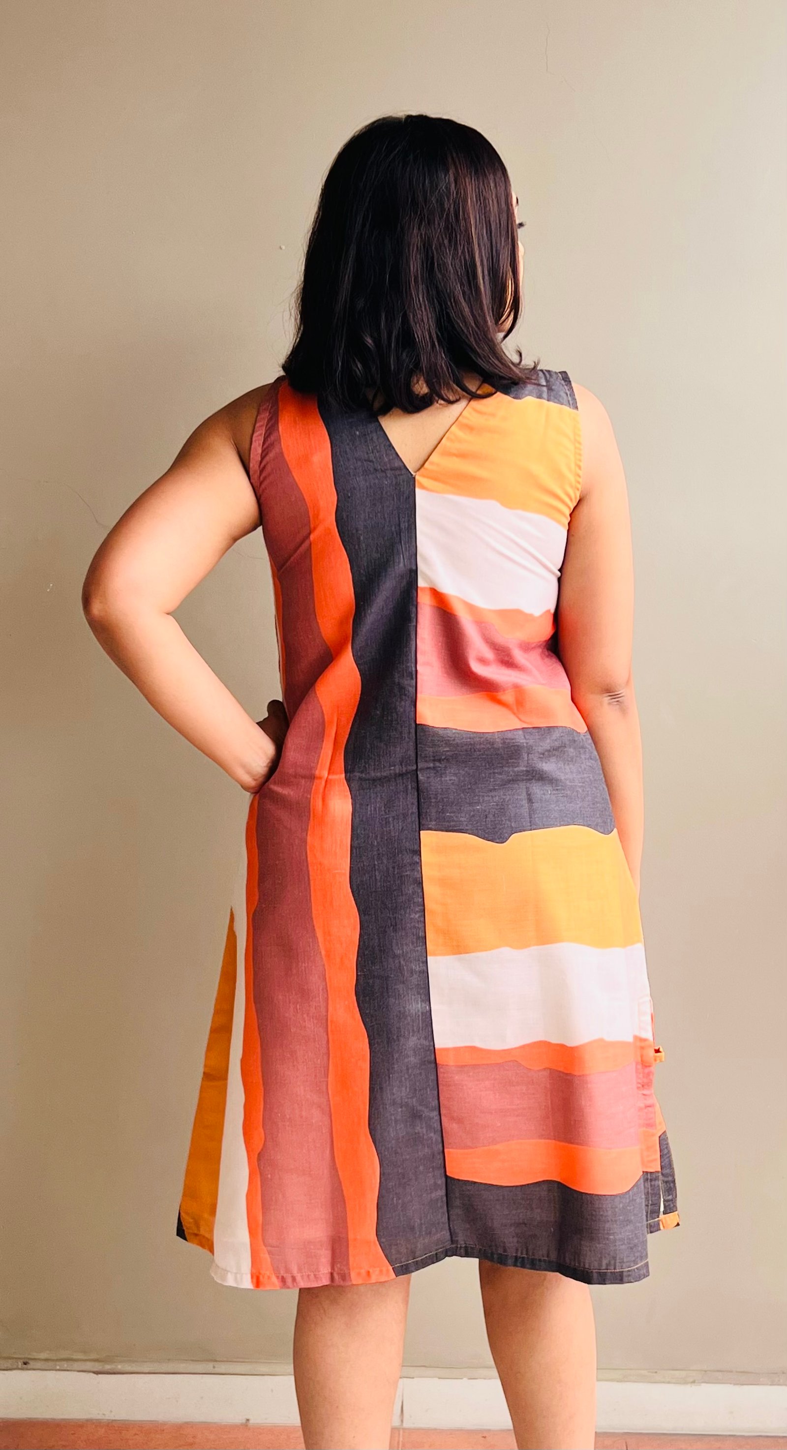 Like wearing a piece of sunset. This printed cotton dress celebrates color in wide, painterly stripes of orange, rust, and soft blush. Lightweight and sleeveless, it’s made to move with the breeze. Easy, breathable, and endlessly wearable. Whether you’re traveling, stepping out for brunch, or simply enjoying a golden-hour walk, this dress feels like summer wrapped in fabric.
